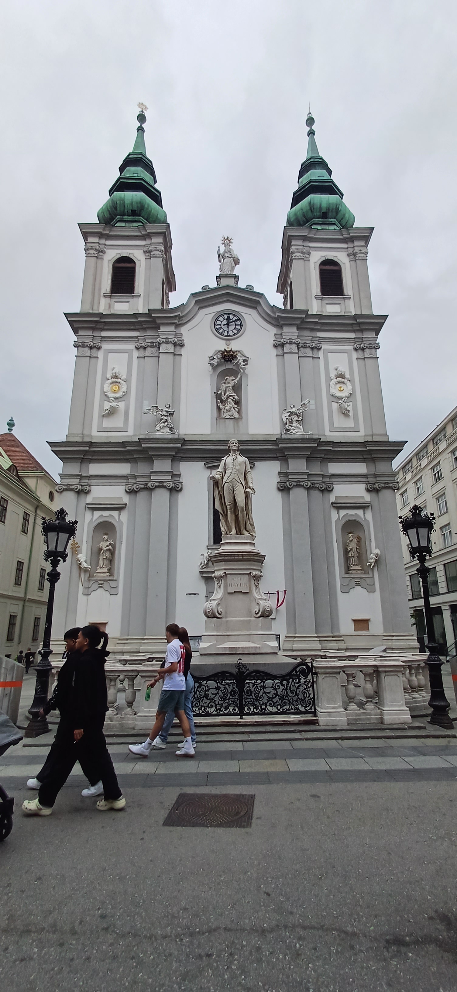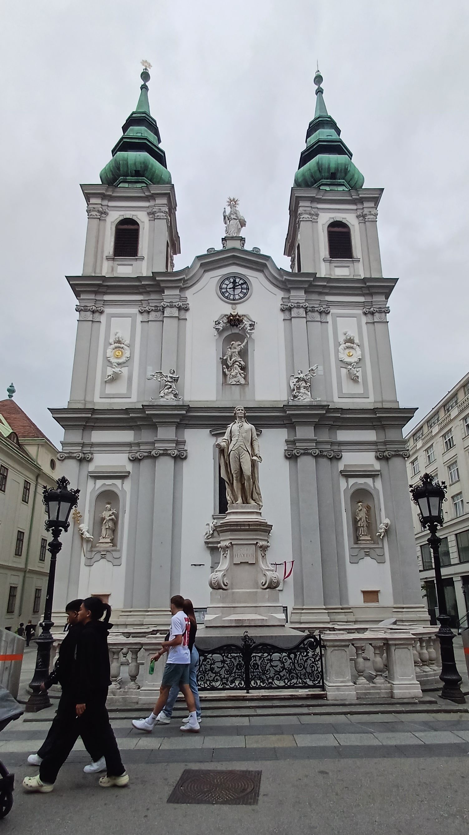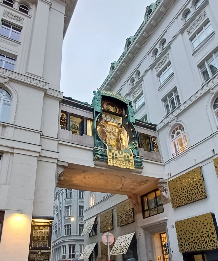 Auf einer Gasse, dem Bauenmarkt, kam ich unter einer Art Viadukt hindurch. Auf der anderen Seite stand ein Rudel (mutmaßlicher) Touristen mit ihren Smartphonekameras im Anschlag bereit. Allerdings nicht für mich (was ich natürlich auch nicht annahm), sondern um die historische Anker-Uhr auf der anderen Seite des Viadukts zu fotografieren oder zu filmen. In einer Art „touristischem Reflex“ drehte ich mich flugs um 180 Grad, um ebenfalls meine Kamera in dieselbe Richtung auszurichten. Just in dem Moment, als ich die Uhr mit ihren allegorischen Figuren sah, ertönte der 20.00 Uhr Glockenschlag. Weiter passierte … nix. Ein spektakuläres Figurentheater wie bei der astronomischen Uhr am Prager Rathaus blieb aus. Hm. Ich hab es gerade bei Wikipedia nachgeschaut. Die Uhr, die von der Anker-Versicherung an ihrem Gebäude am Fleichermarkt in Auftrag gegeben und 1915 erstmals getestet wurde, liefert ausschließlich zur Mittagsstunde ein Musik- und Figurenspektakel ab.