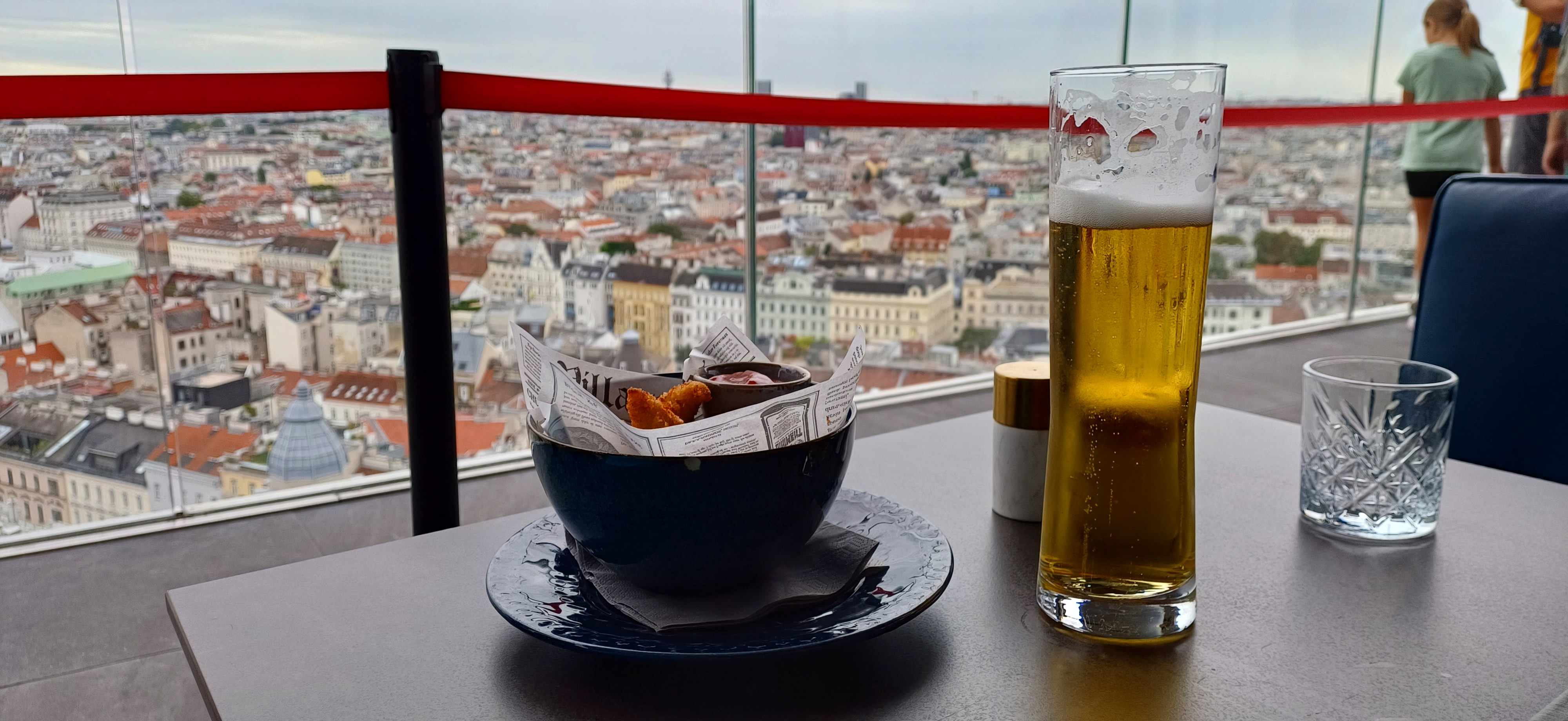 Schließlich war ich im Gebäude und an der Kasse angekommen und löste ein Ticket. Ich las auf einem Schild die Empfehlung, die Tour ganz oben anzufangen und mich dann Stockwerk für Stockwerk nach unten vorzuarbeiten. Also fuhr ich mit dem Aufzug in die neunte Etage und ging von da aus die Treppen bis ins oberste Stockwerk, das elfte. Hier gab es eine Aussichtsplattform mit Blick auf die Stadt und ein Restaurant. Da es Mittagszeit war und ich ohnehin geplant hatte, in der Gastronomie der Einrichtung etwas zu essen, bestellte ich mir Bier und geschreddertes Huhn mit Dip, welches ich dann mit Blick auf die Dächer der Stadt verzehrte.