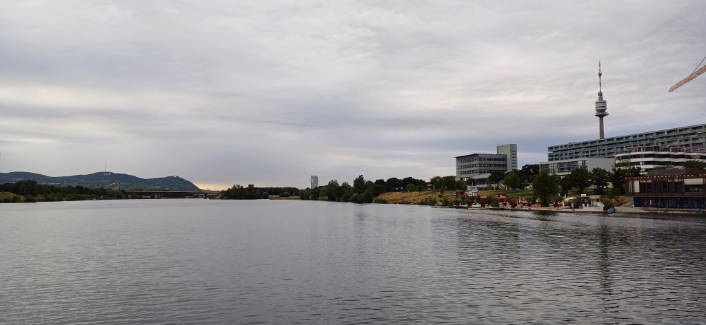 Da es erst gegen 18 Uhr war und der Film erst um 20.30 Uhr begann, beschloss ich, nicht am Schwedenplatz auszusteigen, sondern weiter bis zur Haltestelle Donauinsel zu fahren. Diese befindet sich in der Reichsbrücke, welche die Donau samt Donauinsel überspannt. Man kann von da aus sowohl beide Ufer der Donau, als auch die Donauinsel erreichen. Eigentlich wollte ich mal auf die Insel, folgte aber einem vielversprechenden Schild „Copa Beach“. Das war am nordwestlichen Donau-Ufer. Es gab Skater, die Tricks unter der Reichbrücke probten, viele Schwäne und ein paar Enten im Wasser und Gastronomie und einen kleinen Strand mit Liegestühlen sowie einen Badesteg. Aber ich wollte ja eigentlich zur Insel, also überquerte ich die Fußgängerbrücke „Ponte Cagrante“, die dorthin führte.