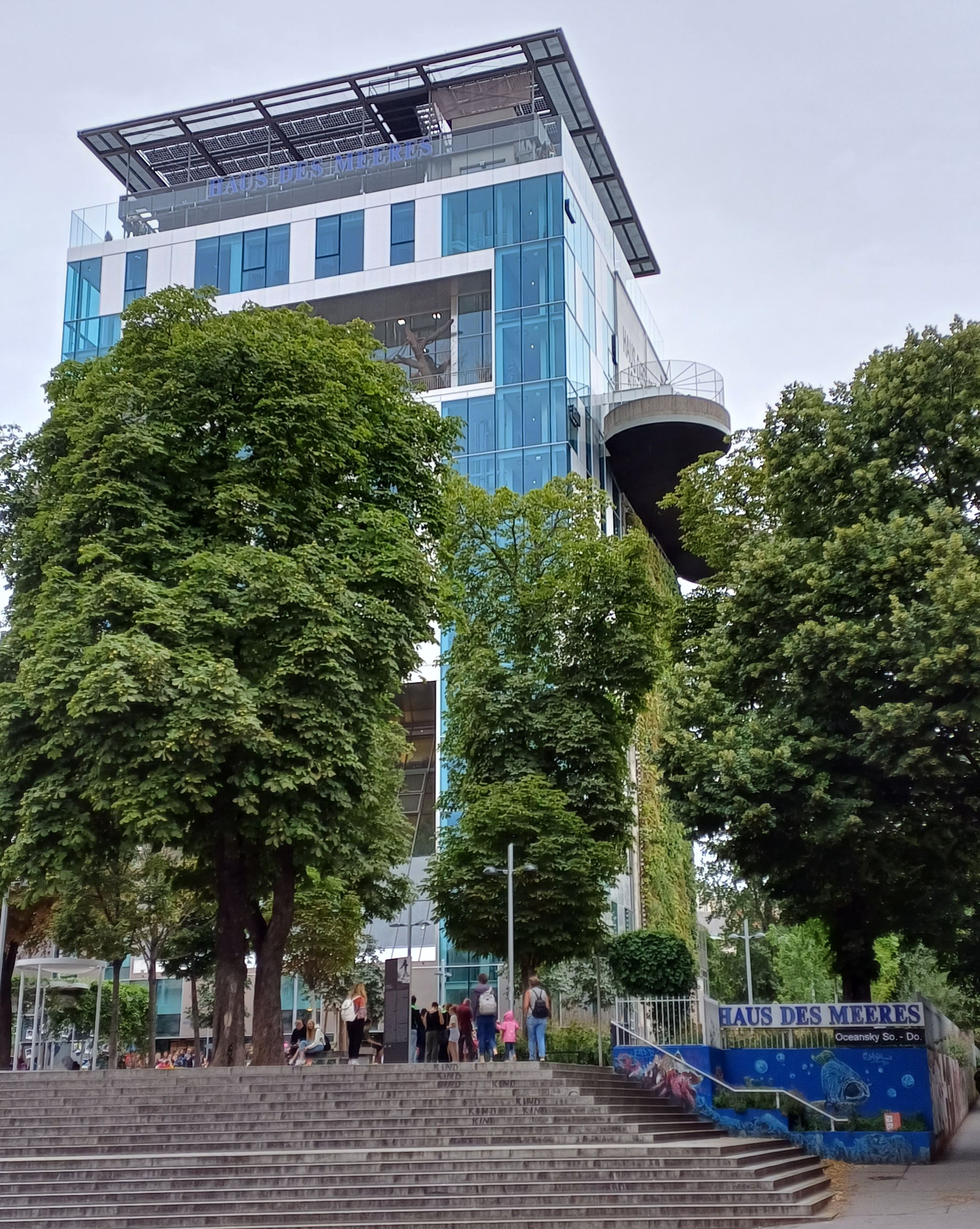 Ich ließ mich von Google zum „Haus des Meeres“ führen. Dabei kam ich an der prächtigen Mariahilfer Kirche vorbei und machte schnell ein paar Bilder. Angekommen am „Haus des Meeres“ machte sich zunächst eine gewisse Ernüchterung breit – vor dem Eingang stand eine Riesenschlange, und Nieselregen setzte ein. Guides vom Museum verteilten allerdings Regenschirme, ich verzichtete aber auf den Schirm und auch darauf, meine Regenjacke anzuziehen – allzu viel kam nicht herunter. Ein Guide meinte zu (mutmaßlich) einem Vater mit Sohn vor mir, die Wartezeit betrüge etwa 45 Minuten. Im Gegensatz zu diesen beiden entschied ich mich, die Wartezeit in Kauf zu nehmen.