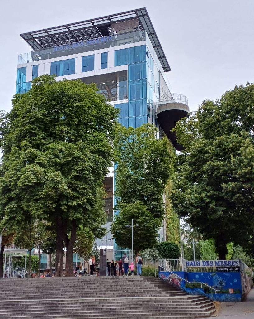Insgesamt muss man sagen, dass „Haus des Meeres“ die Einrichtung also nur unvollständig beschrieb, obwohl es den Kernpunkt der Ausstellung beschrieb. Eigentlich war es eher ein vertikaler Zoo, auch wenn natürlich große Wildtiere fehlten, die man in einem Gebäude halt nicht halten kann. Wie auch immer, mir gefiel die Ausstellung gut. Sie war vor allem edukativ auf Kinder ausgerichtet, denn die Schautafeln waren kindgerecht und leicht verständlich (sogar ich habe sie verstanden). Es waren auch viele Kinder mit ihren Eltern unterwegs. Bei einem der Aquarien beneidete ich sie darum, dass sie im Gegensatz zu mir einen Krabbeltunnel durch eins der großen Aquarium nutzen konnten, das sah echt spannend aus!