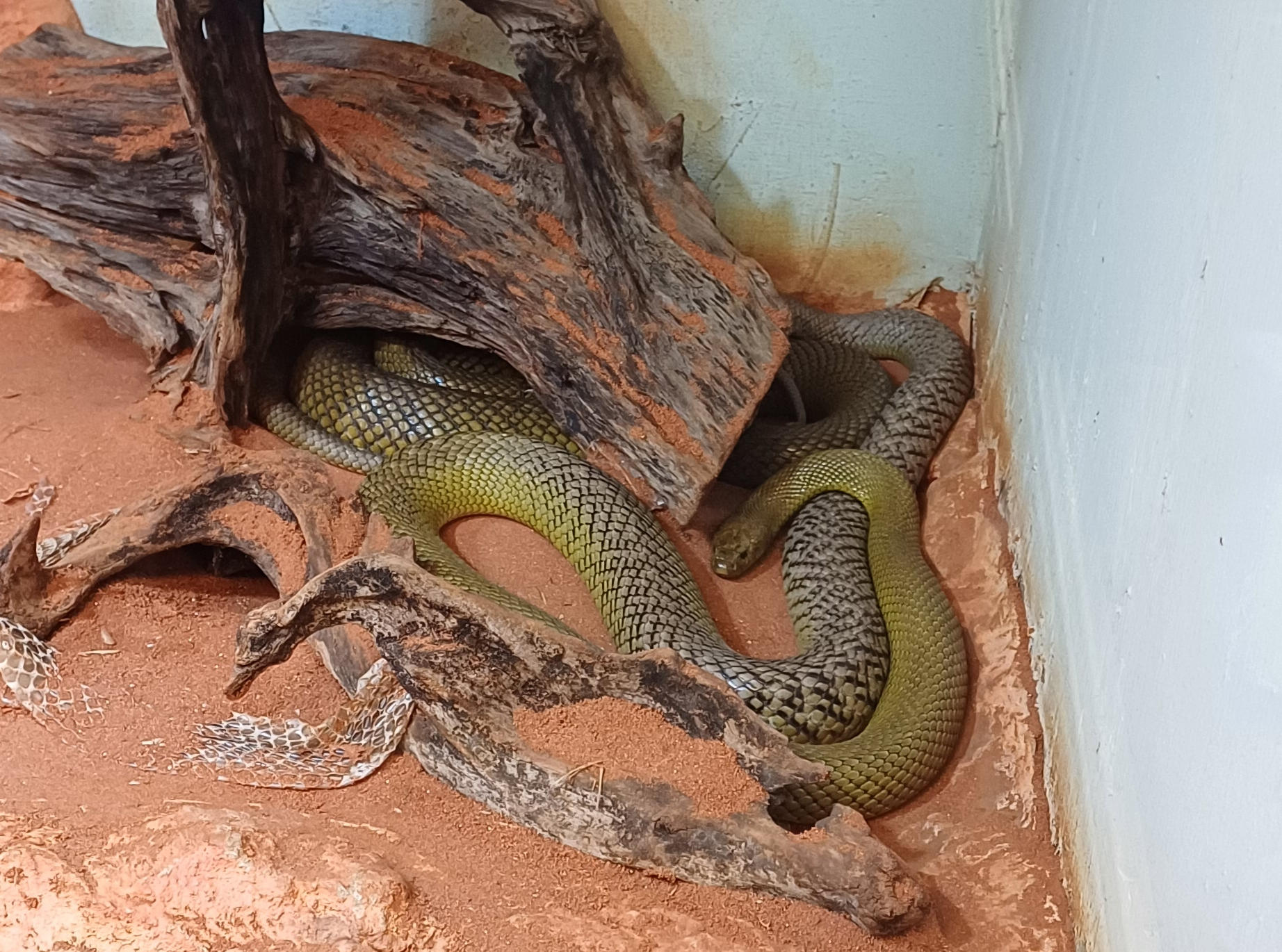 Ich arbeitete mich Etage für Etage weiter nach unten. Es gab viele kleine Aquarien und Terrarien mit Fischen, Krebstieren, Spinnen, Schlangen und Echsen, durchsichtige Kunststoffröhren mit Blattschneiderameisen. In einem Aquarium bewegten sich unzählige, weiße Kanonenkugel-Quallen in einem quirligen Reigen. Ich sah riesige Pythonen, und sehr giftige Schlangen wie die grüne Mamba und den Inland-Taipan. Letzteres, in Australien vorkommendes Reptil, soll die giftigste Schlange der Welt sein, ein Biss soll eine Giftmenge enthalten, die für 230 Menschen zum Ableben reichen sollte. Allerdings seien die Tiere so scheu, dass es kaum zu Begegnungen mit Menschen käme, zwischenzeitlich galt die Art sogar als ausgestorben, weil es keine Sichtungen gab.
