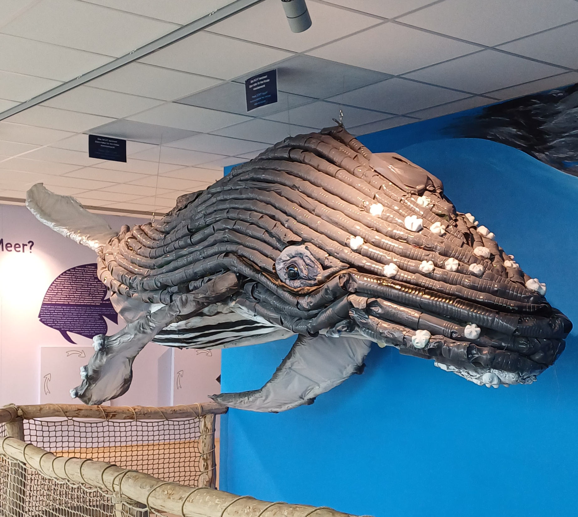 Eine ganze Etage schien mir neben einer Ausstellung über die Meeresforscher Hans und Paula Hass schwerpunktmäßig dem Thema gewidmet zu sein, wie der Mensch den Meeren schadet. Im Wesentlichen ging es um die Verschmutzung durch Plastik, aber auch um Überfischung. Und darum, was jeder einzelne durch sein Konsumverhalten dazu beitragen kann, dem Meer möglichst wenig Schaden zuzufügen (Kunststoffe und Mikrokunststoffe möglichst meiden, ggf. fachgerecht entsorgen, bei Meerestieren auf Siegel achten, die auf nachhaltige Fischerei verweisen). Auch das war für Kinder leicht verständlich dargestellt. Besonders beeindruckt hat mich die Skulptur eines großen Wals aus Plastik, die unter dem Titel „The last whale“ von Schüler:innen eines Gymnasiums aus Kunststoffabfällen angefertigt worden war. Schautafeln zufolge führte das Engagement dieser Kinder in der Folge zu einer von der UNO unterstützen, von Kindern veranstalteten und geleiteten Konferenz zum Schutz der Meere, der nebst anderen Persönlichkeiten diverse Staatsoberhäupter und der Papst beiwohnten.