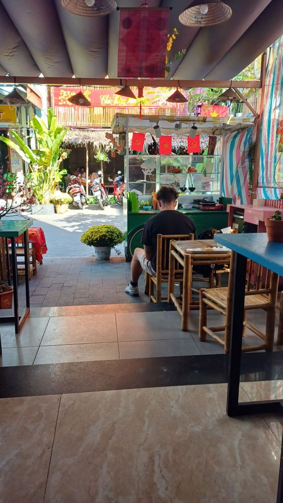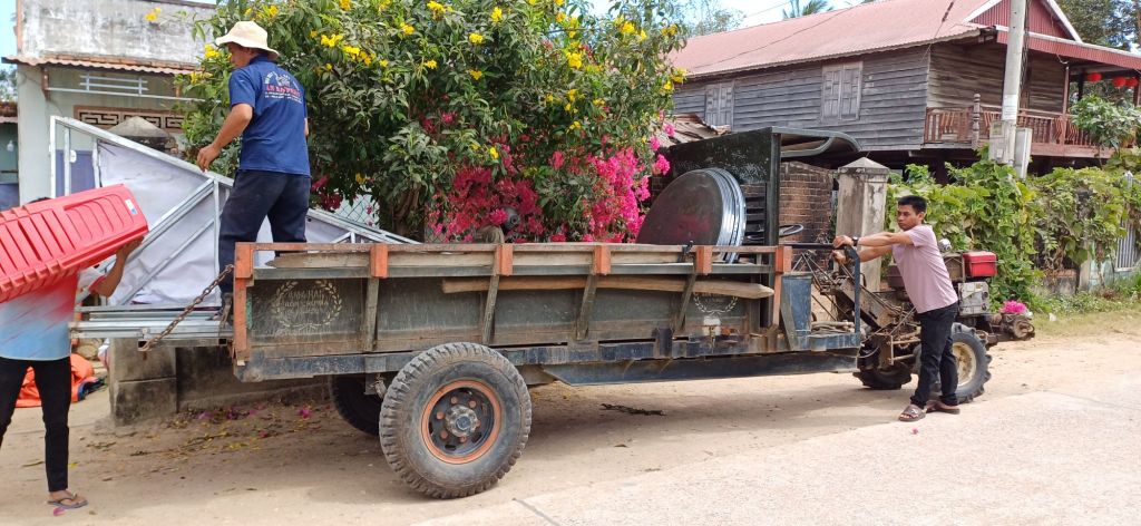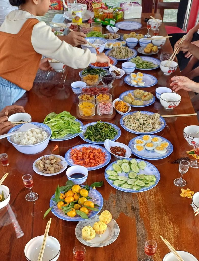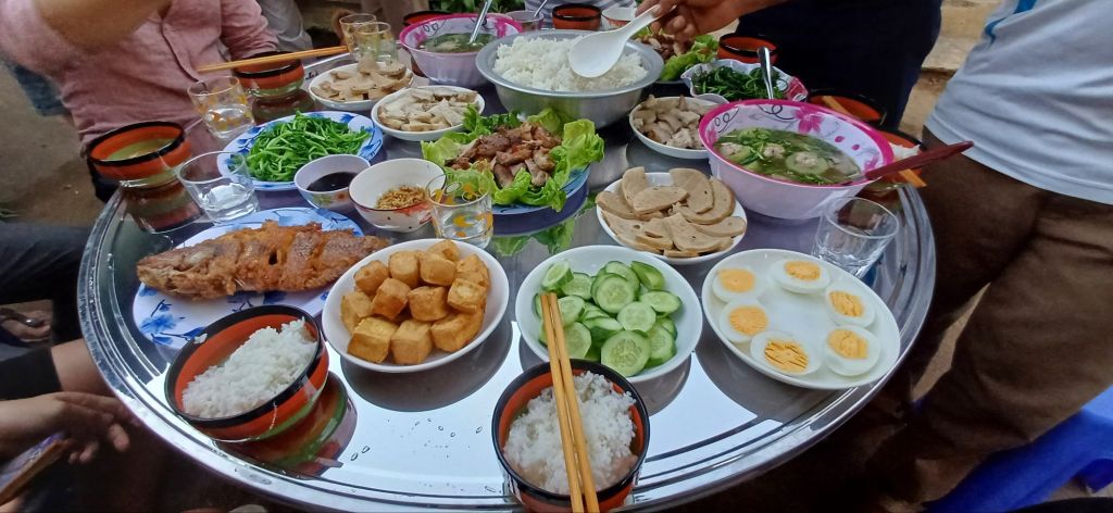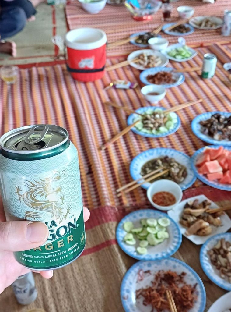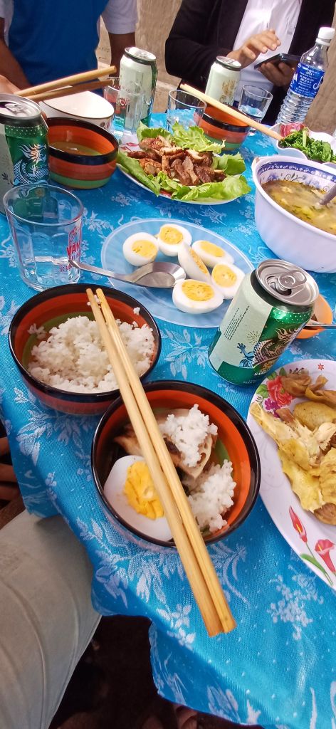 Wir hatten alle ausgecheckt und bezahlt und fuhren mit den Koffern wieder zum Haus der Eltern der Freundin meines Neffens. Hier hatte man gerade das Festzelt von der Party am Vortag wieder abgebaut und war noch dabei, Plastikstühle auf ein landwirtschaftliches Fahrzeug zu verladen. Danach gab es vietnamesisches Frühstück mit Suppe, Reis, hartgekochten Eiern, verschiedenen Fleisch- und Gemüsesorten… Ich mag das ja ganz gerne, aber irgendwie gibt es das scheinbar zu jeder Mahlzeit, und jeden Tag. So kommt es mir jedenfalls vor. Wirklich viel Abwechslung ist da nicht am Start. Vielleicht bin ich einfach zu sehr verwöhnter West-Europäer.