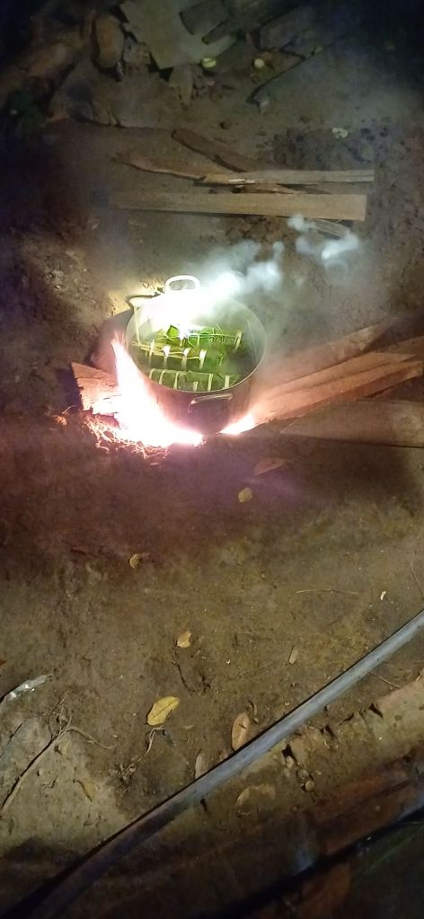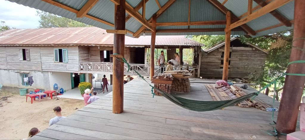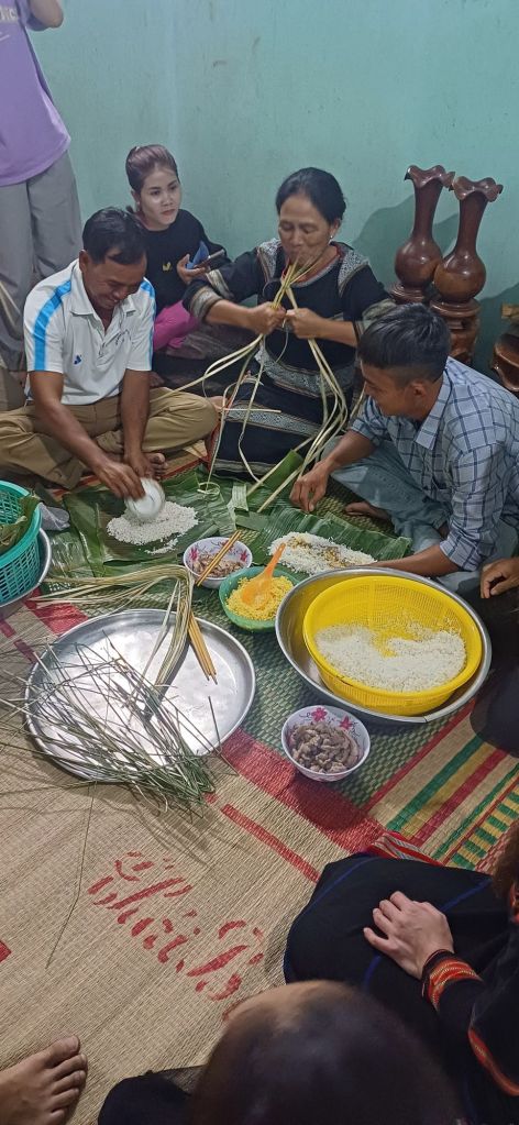 Wir gingen dann zu Fuß durch die Nachbarschaft, um drei verschiedene Häuser bzw. deren Einwohner zu besuchen. Das erste war das des Bürgermeisters des Dorfes. Wir hatten gerade gegessen, und es wurde wieder beängstigend viel aufgetischt, natürlich Reis, verschiedene Fleisch- und Gemüsesorten, Suppen … und Süssigkeiten und Wassermelone und so weiter. Mir fiel es da schon schwer, gute Miene zu bewahren. Es ist für mich nicht so einfach, wenn ich von den Jarai auf Jarai oder Vietnamesisch angesprochen werden, als würde ich die Sprache verstehen. Ich fühl mich dann einfach nur unhöflich bis hilflos und innerlich irgendwann völlig frustriert.