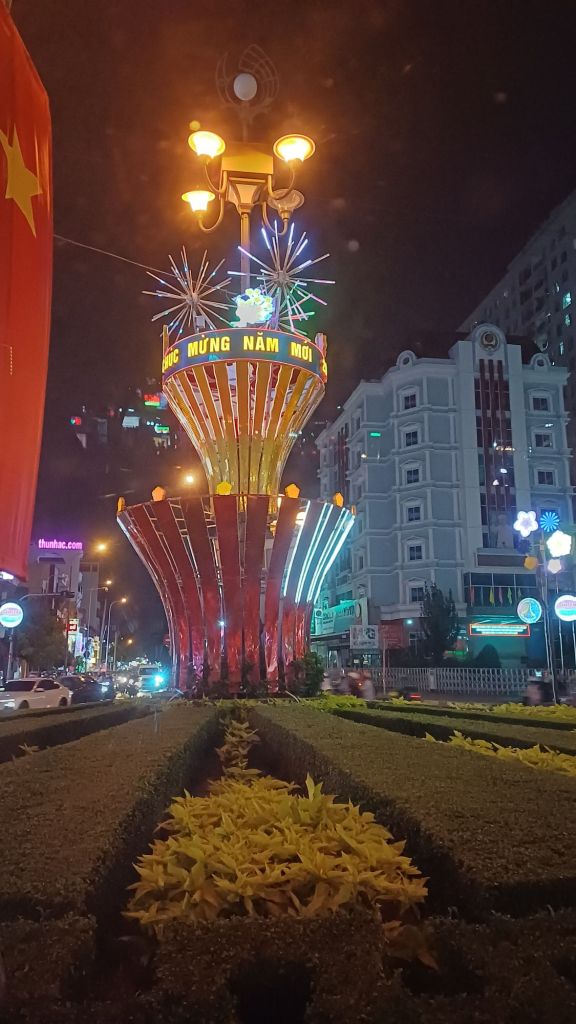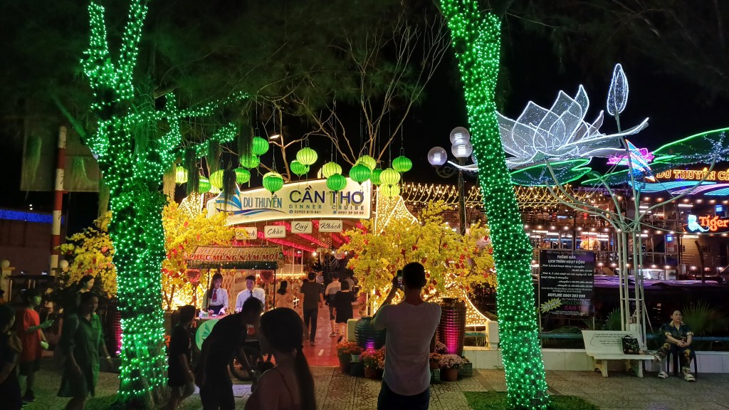 In Can Tho selbst fühlte ich mich an Las Vegas erinnert, weil an den Straßenrändern und auf Verkehrsinseln bunte Dekorationen emsig und bunt blinkten. Meiner Schwester zufolge sind das vorübergehende Blickfänger für das bevorstehende Tet-Fest (chinesisches Neujahr), das hier eine große Sache ist – und man betreibt in den Städten dafür eben etwas, was mit unseren Weihnachtsdekorationen vergleichbar ist).