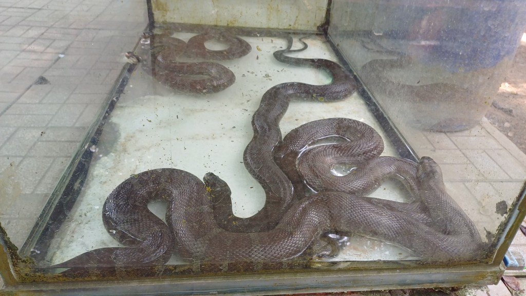Wir fanden in einer der Hütten Platz und mein Schwager bestellte ein paar Kleinigkeiten, Wasser, süsse Snacks und Kokoswasser. Zum Leidwesen meiner Schwester wurde letzteres nicht in der Kokosnussschale, sondern in Plastikbechern serviert. Nach dem Genuss der Erfrischungen haute sich meine Schwester in eine in der Hütte aufgehangene Hängematte, der Freund meines Neffen (den wir bald in Da Nang besuchen), dessen Freundin und ich machten uns daran, das weitläufige Gelände näher zu erkunden. Es gab viele Gräben, vermutlich ursprünglich Bewässerungsgräben für den Reisanbau, viele Hütten mit gedeckten Tischen, einige auch belegt von dosenbiertrinkenden Menschen. In den Gräben waren große Fische unterwegs (vermutlich Karpfen), ansonsten stromerten zwei junge Katzen und mindestens zwei Hunde umher (die Katzen) bzw. lagen im Schatten (die Hunde). Achja, in einem Glaskasten wurden Schlangen gehalten, die aber zum Verzehr angeboten wurden.