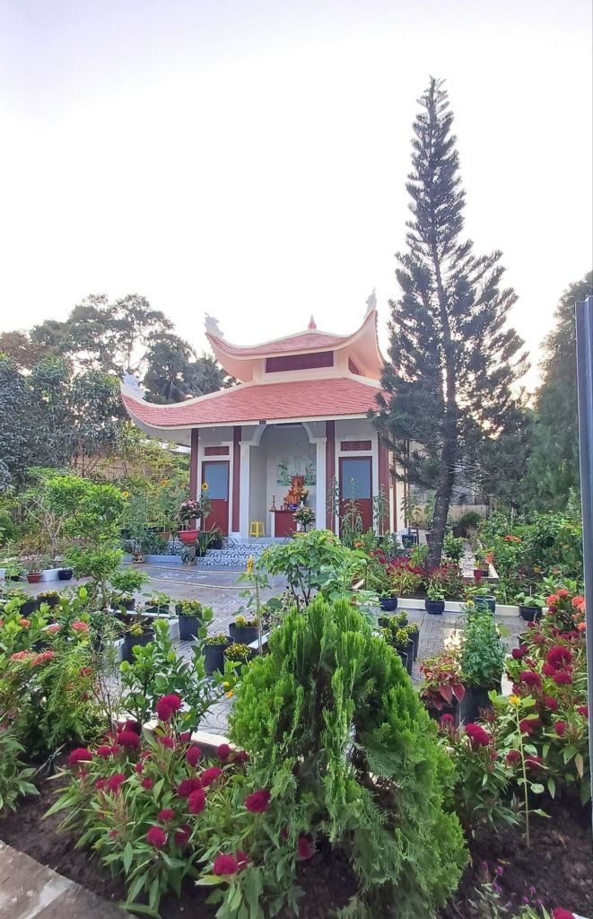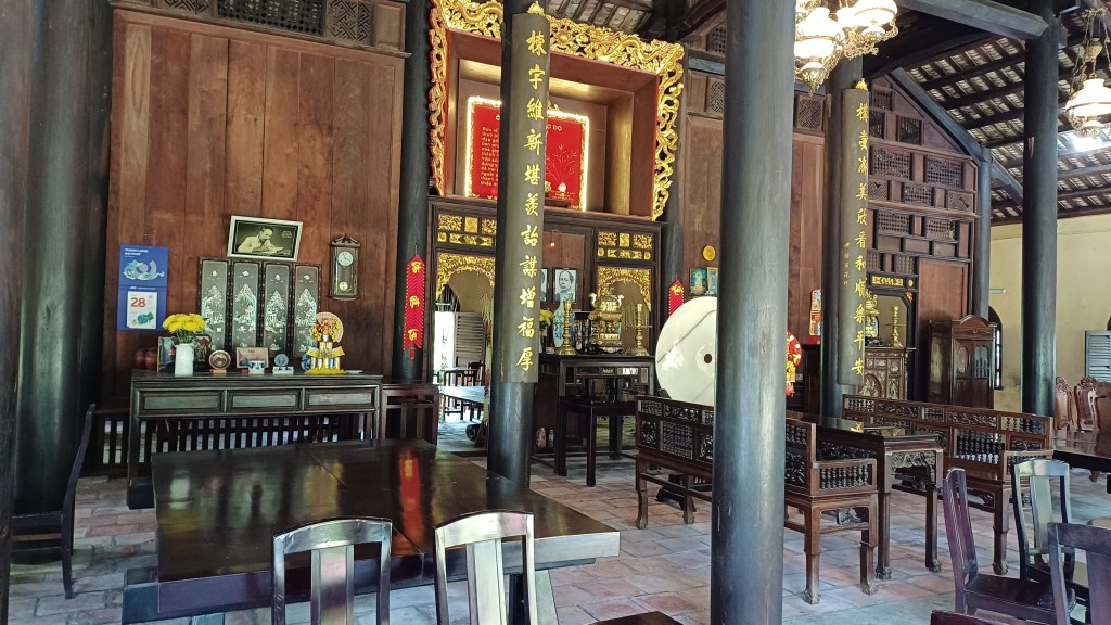 Ahnenaltare und auch eine Gedenkstätte für den Gründer Ho Chi Minh (das isst das Bildnis recht oberhalb von vier Hochkant-Kunstwerken, die aus lackierten Eierschalen gemacht sind). Wenn man eine Einrichtung wie diese betreibt, sollte man sich mit den Behörden gut stellen, und das bedeutet, die aktuelle Regierung so wie die Ursprünge des politischen Systems öffentlich anzuerkennen. Vielleicht hat man insgeheim eine andere Meinung, hängt aber die besser öffentlich nicht an die große Glocke.