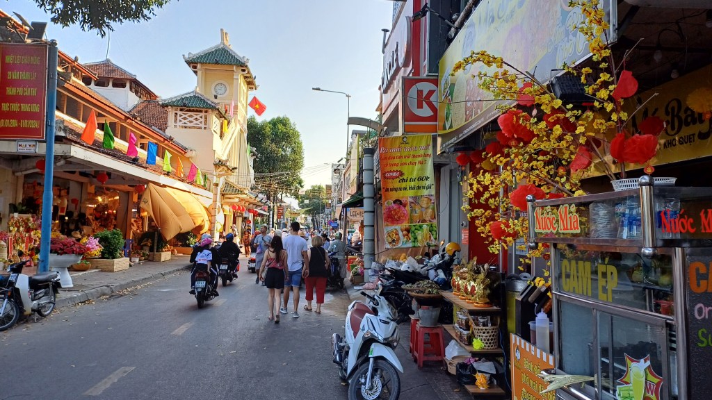 Unterwegs am frühen Abend zum Abendessen. Die gelben Blüten rechts (manchmal echt, manchmal aus Plastik) gehören zur typischen Deko für das anstehende Tet-Fest, das sich hier überall schon abzeichnet.