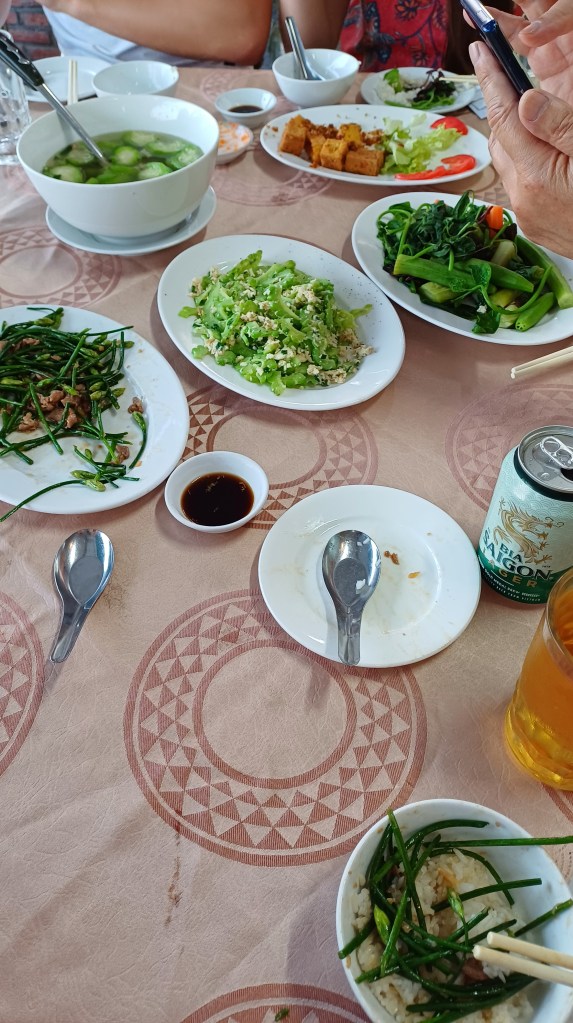 Mein Schwager hatte in einem Restaurant am Fluß, dem Sông Hâu gebucht, genauer gesagt, an einem Nebenarm davon. Der Sông Hâu ist wiederum einer der neun Arme des Mekongs, die das Mekong-Delta bilden. Nach kurzer Besprechung orderte mein Schwager Getränke und eine Anzahl Speisen. Dabei waren eine Suppe mit Krebstierfleisch und einem mir unbekannten Gemüse, das geschmacklich relativ neutral an Gurke erinnerte, gebratener Tofu, grüne Sprossen mit gebratenem Rinderhack, weiteres, gekochtes Gemüse verschiedener Art und ein ziemlich bitter schmeckendes Gemüse, das mir auch unbekannt war, und natürlich reichlich Reis. Manches schmeckte mir, anderes weniger, aber es gab auf jeden Fall viel auszuprobieren. Der Freund meines Neffen, ein ziemlich sportlicher Bursche mit hohem Kalorienbedarf, schaffte es am Ende, sein Versprechen einzulösen und wirklich alles aufzuessen. Ich hatte schon lange vorher die Waffen gestreckt.