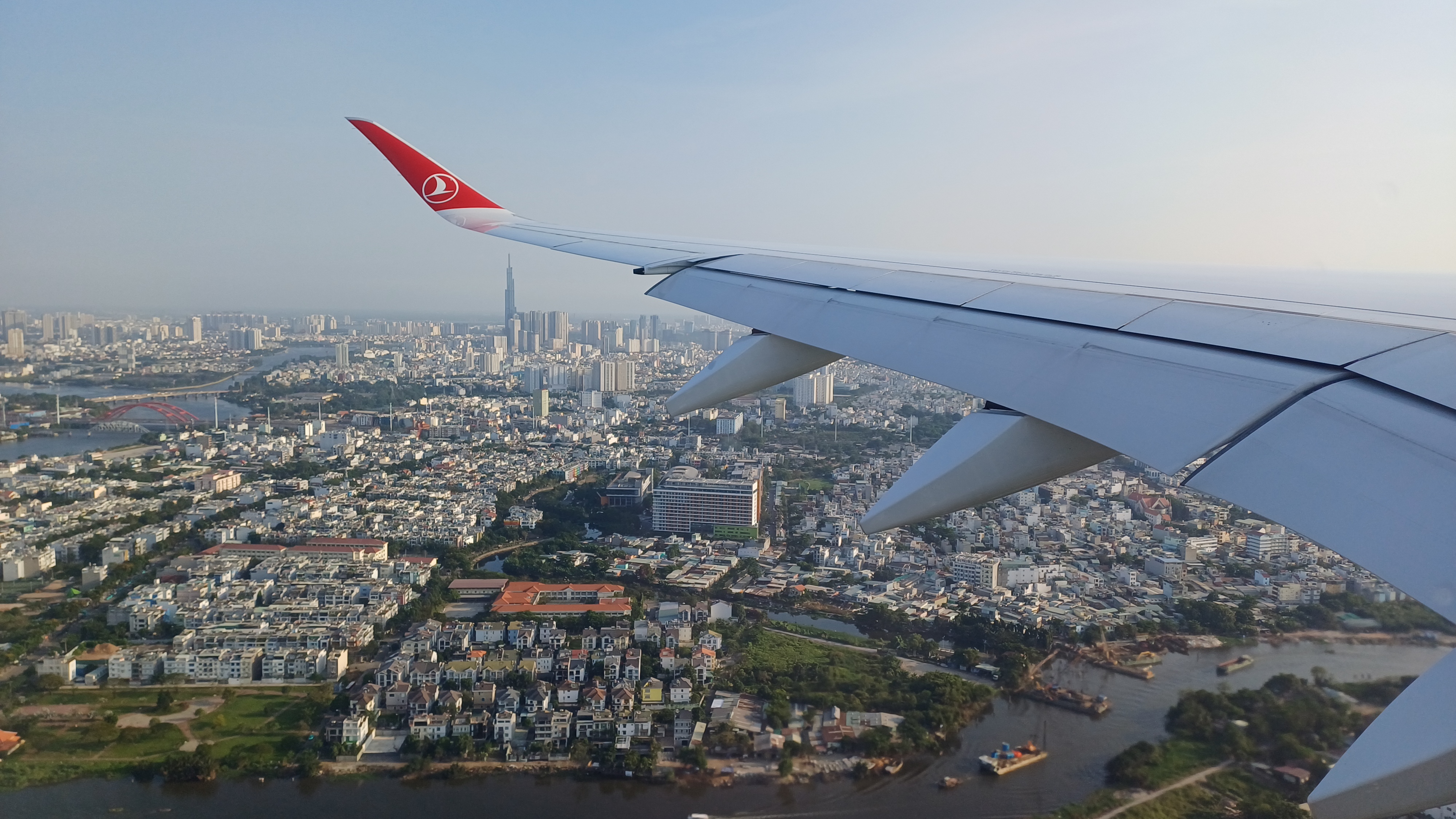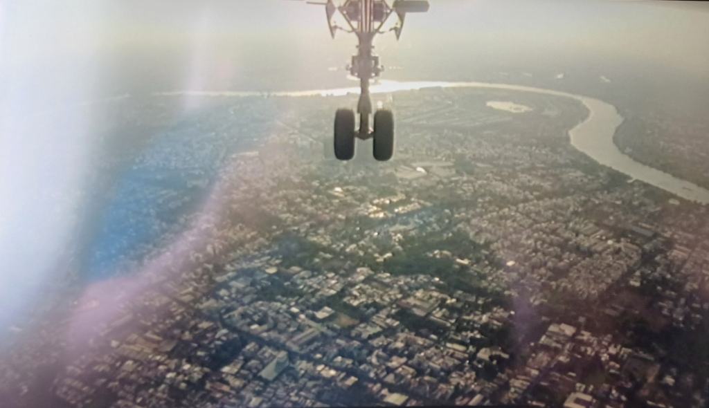 Es war längst heller Tag an unserer Position, aber die Blinds der Fenster blieben noch lange geschlossen, um den Passagieren zu ermöglichen, ihren Schlafrhythmus beizubehalten. Irgendwann begann dann doch der Tag an Bord, und es gab Frühstück – Omelette und ein Brötchen mit Käse oder Marmelade (je nachdem, was man halt drauf machte) und Getränke. Nicht lange danach begann auch schon der Landeanflug. Ich saß am Fenster und konnte bei der Landung viel von der Großstadt Saigon sehen, die ausgedehnten Flusslandschaften samt Schiffsverkehr, große Hochhäuser, Hafen und Industrie und andere Wohngebiete. Dann setzten wir auf und rollten zum Terminal.