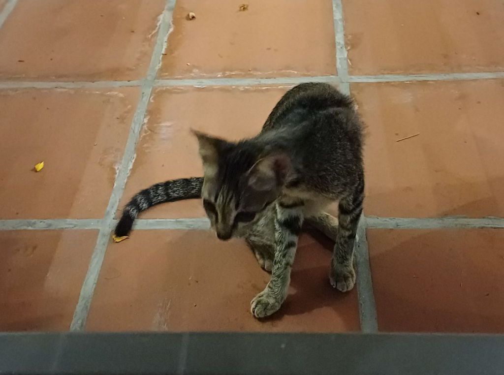 Wir wurden also herzlich im Wohnzimmer von Duc empfangen, bekamen unsere Zimmer (ich habe eins für mich samt Badezimmer, großem Bett, Klimaanlage und Fernseher) und wurden von Duc durch das ganze Anwesen geführt. Zwar ist das Haus nach westlichem Standard und sehr modern eingerichtet, aber da es ja sowohl Gäste, als auch Wohnhaus der Familie ist, gibt es eben doch auch viel vietnamesischen Touch. Ein Raum enthält alte Möbel vor Eltern meines Schwagers und seines Bruders, samt einer Bibliothek. Es gibt einen Ahnenaltar, was in der vietnamesischen Kultur häufig zu sehen ist. Die Vietnamesen ehren ihre Vorgängergenerationen, sowohl noch zu Lebzeiten, als auch darüber hinaus, sehr. Das täte auch unserer deutschen Gesellschaft manchmal gut, denke ich. Mehrere (Dach)terrassen laden mit Sitzgruppen und Topfplanzen zum Verweilen draußen ein. Außerdem gibt es noch einen Mops (ja, so einen Hund) und ganz neu eine noch sehr junge Tigerkatze von der Straße, die gerade erst hier anfängt, heimisch zu werden. Sie ist hier willkommen und bekommt Essen und Streicheleinheiten und wurde sofort zur Attraktion der Reisegruppe.