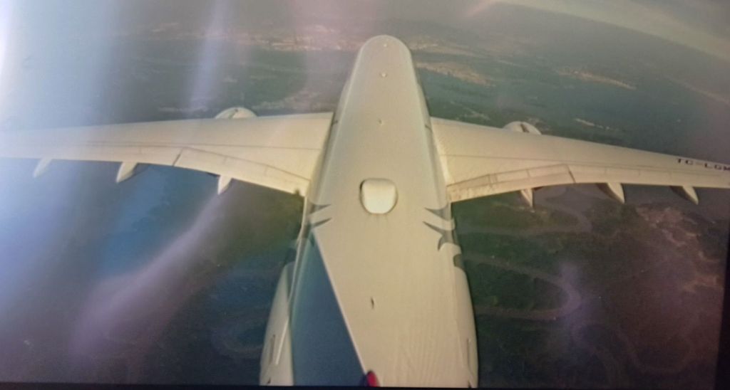 Der Großraumflieger der Turkush Airlines hatte vergleichsweise große Bildschirme für das Onboard-Entertainmentsystem, auch größere als der A321 Neo derselben Linie, mit dem wir nach Istanbul gelangt waren, und dieselbe Auswahl an Filmen, TV-Programmen, Fernsehserien, Spielen, Fluginformationen (Geschwindigkeit, Höhe, Kurs, Position etc.) aber noch ein Feature, das ich ziemlich cool fand: Zugriff auf drei Kameras außen Am Flugzeug. Es gab zwei Kameras unter dem Rumpf, von denen eine den Blick senkrecht nach unten und eine den Blick nach vorne zeigte. Eine dritte Kamera am Seitenleitwerk zeige einen Blick nach vorne und den größten Teil der Maschine selbst von schräg oben. Die Kamera unter dem Rumpf zeigte auch das Bugfahrwerk, wenn es ausgefahren war. Das war interessant bei den letzten Vorbereitungen vor dem Flug, beim Taxiing und beim Ein- und Ausfahren des Fahrwerks. Die Kamera auf dem Seitenleitwerk zeigte einen guten Blick auf die Tragflächen und das Hauptfahrwerk, so dass man sehr gut Vorflügel-, Lande- und Störklappen sehen konnte. Das war schon ein nettes Feature, welches ich so noch nicht kannte. Meine vorangegangenen Flüge waren im Jahr 2016 gewesen, und meine letzten Flüge in einem Großraumflugzeug wahrscheinlich so 2011.