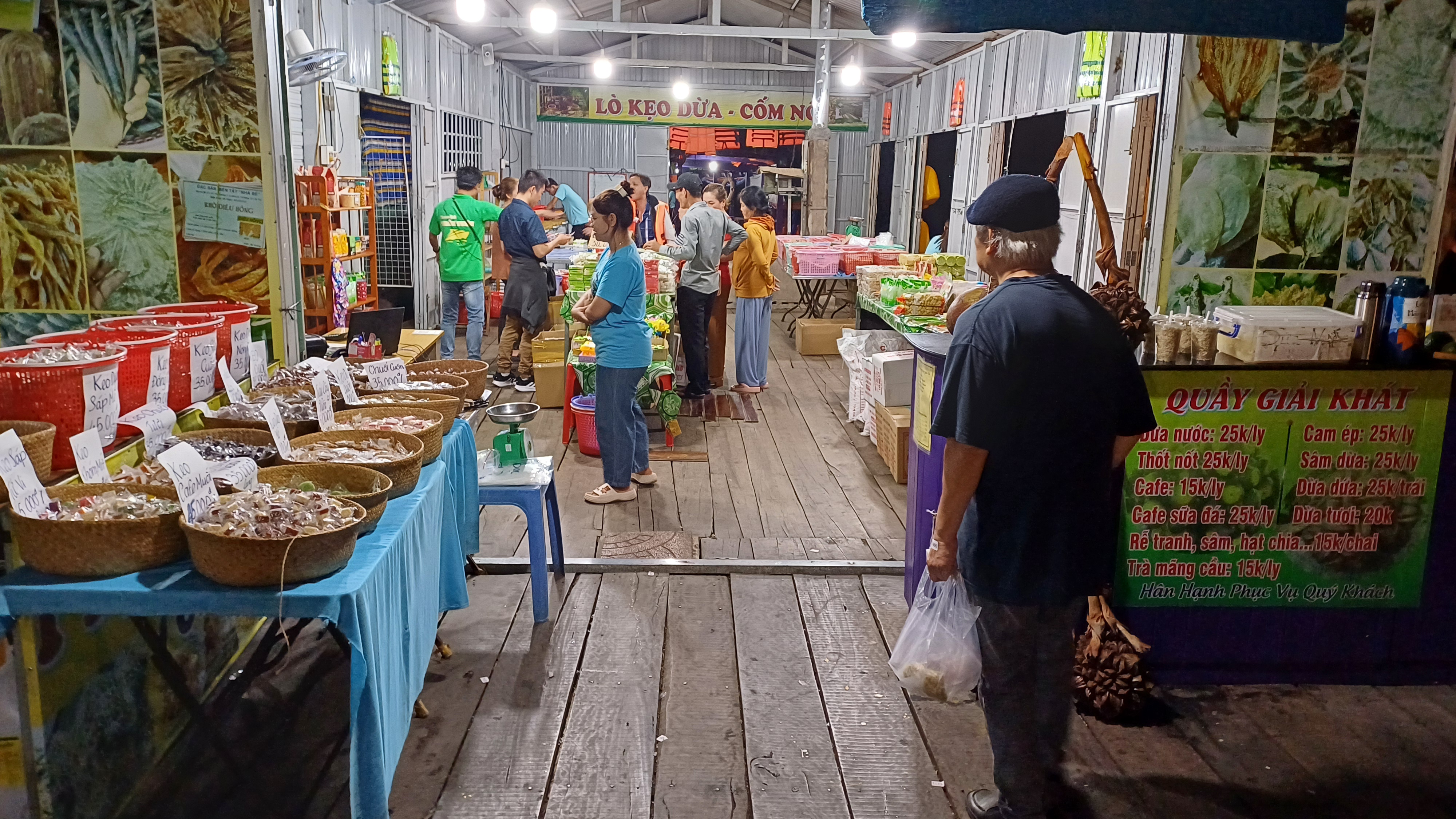 Neben den Nudeln in verschiedenen Farben gab es auch Süssigkeiten zu kaufen, getrockneten Fisch, Spirituosen, Sonnenhüte, Dinge aus Holz und vieles mehr. Ich streifte durch die vier aneinander gedockten Shops und kaufte eine Art Reisgebäck mit Kokosnuss-Geschmack. Danach gingen wir wieder auf unser Boot und traten die Heimfahrt an. Unterwegs legten wir noch an anderer Stelle an, wo wir in einem Markt an Land noch eine andere, traditionelle Art der Nudelherstellung sehen konnten.