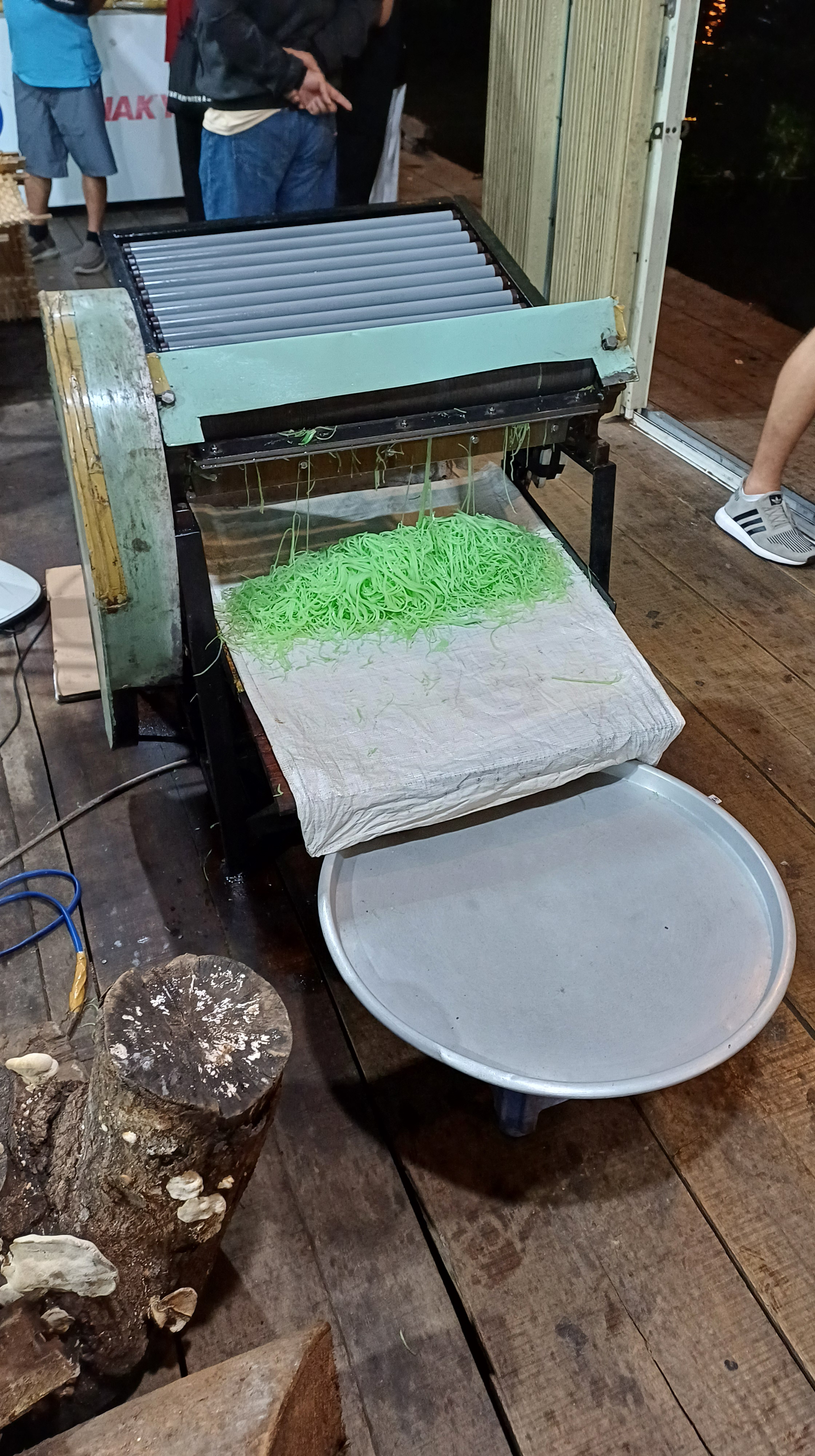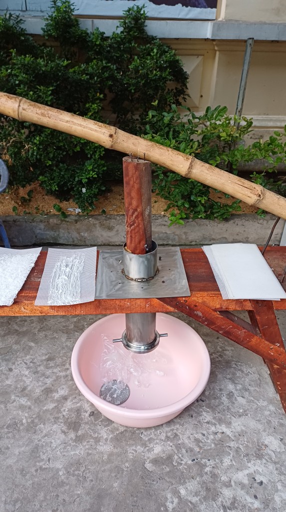 Traditionelle Nudelherstellung mit einer Presse, die einen langen Bambus als Hebel nutzt.
