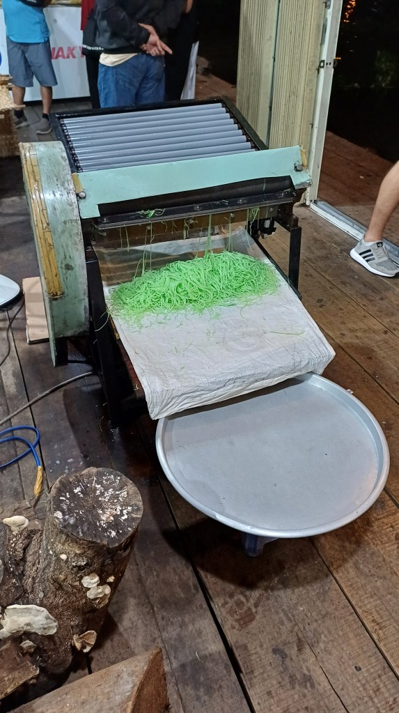 Auf im ersten Shop konnten wir zusehen, wie Reisnudeln hergestellt wurden. In einem beheizten Bottich wurde Reismehl mit Wasser lange gerührt. Auf einer von einem Holzfeuer beheizten, heißen Platte wurden daraus dünner Fladen hergestellt, was an die Zubereitung französischer Crêpes erinnerte. Getrollt und in Stücke geschnitten wurde das direkt als Snack angeboten, was wir auch probieren. Die meisten Fladen kamen dann in eine elektrische Nudelpresse, die aus den Fladen lange Nudeln produzierte. Diese wurden dann verpackt und direkt zum Verkauf angeboten.