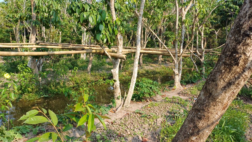 Nach dem Tee konnten wir das Haus und das Gelände erkunden. Das Haus war wirklich sehr bescheiden, es gab eine alte und eine neue Küche. In der alten war noch ein mit Holz befeuerter Herd, der auch noch benutzt würde, obwohl es nebenan in der neuen Küche elektrische Herdplatten gab. Diese waren aber nicht in Küchenschränke eingebaut, sondern standen oben drauf. Ich hatte nicht den Eindruck, als ob es in dem Haus einen Fernseher oder Computer gab (Smartphones haben aber lt. meiner Schwester alle). Während vor dem Haus bunte Blumen blühten, gab es hinter dem Haus landwirtschaftlich genutzte Flächen. Hier gab es Hühner in Käfigen, Kräuterbeete, Kokospalmen und andere Obstbäume. Alles sah allerdings wenig organisiert, naturbelassen und chaotisch aus, was natürlich seinen Charme hatte. Leider nur war an vielen Stellen auch achtlos zurückgelassener Kunststoffmüll zu sehen, sonst wäre es wirklich ein kleines Paradies gewesen. Sowas gefällt mir viel besser als ein perfekt gepflegter Garten. Auch hier (wie am Vortage im Dorf der mütterlichen Verwandschaft meines Schwagers) gab es viele Bewässerungskanäle, die nur mit etwas waghalsig zu überquerenden Brücke zu passieren waren. Irgendwie fühlte ich mich dort ausgesprochen wohl, mir dämmerte, dass dieser bescheidene, simple Lebensstil gegenüber dem Leben in der Stadt im Wohlstand durchaus seine Vorteile haben kann. Es fühlte sich alles so ruhig und friedlich und ECHT an. Ich denke, in diesem Leben kann man absolut und immer man selbst sein, es gibt absolut keinen Grund, sich irgendwie zu verstellen und vorzugeben, jemand zu sein, der man nicht wirklich ist.