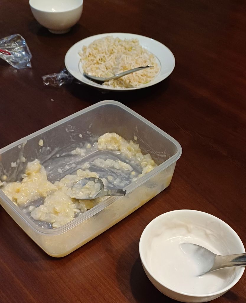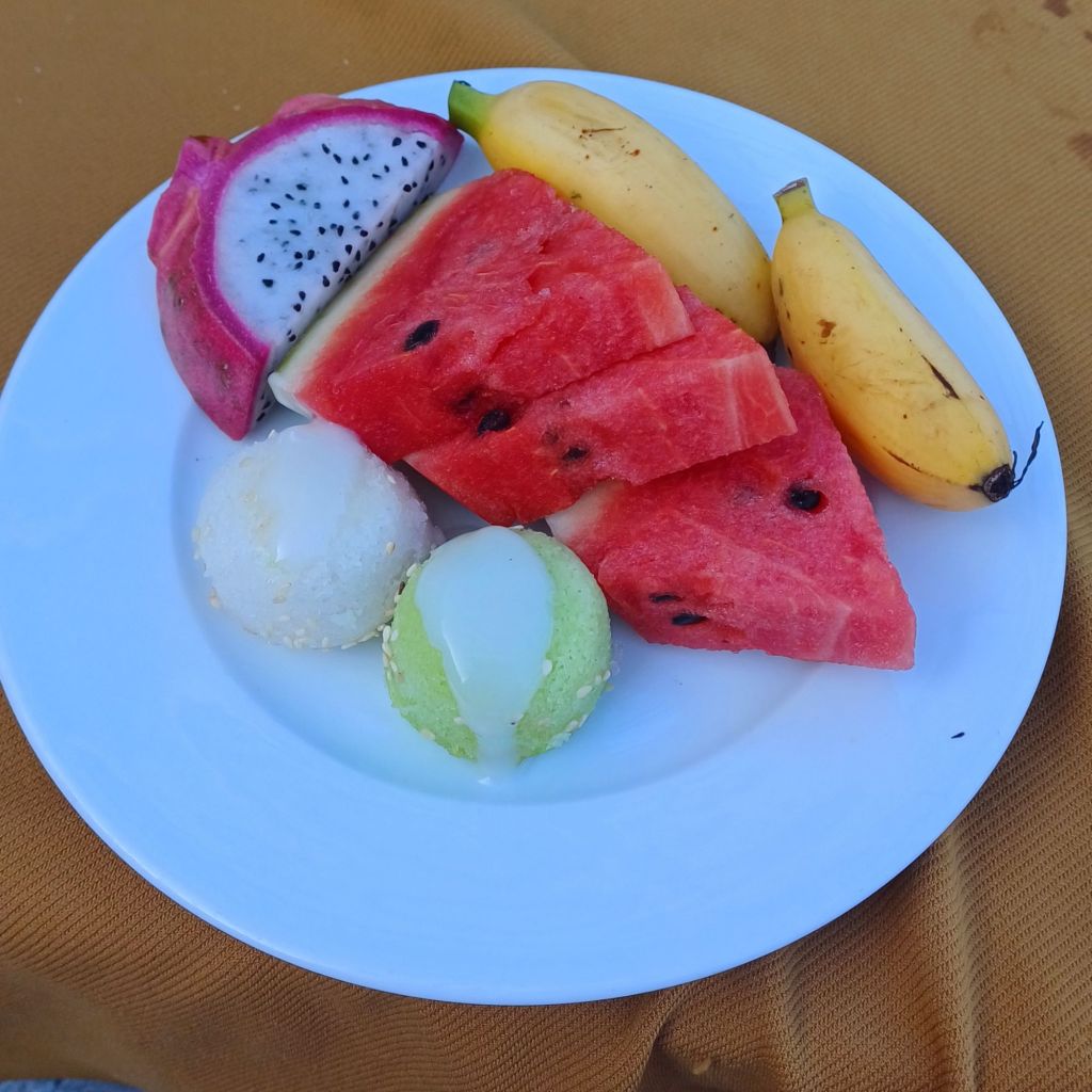 Nach dem Abendessen gingen wir zu Fuss zurück zu Duc’s Gästehaus. Ich holte mir ein Bier aus dem Kühlscharank auf meiner Etage und begann, den Text hier zu schreiben. Nach einer Weile benachrichtigte mich meine Schwester, weil die Dame des Hauses, Duc’s Frau, uns eine Süssspeise zubereitet hatte, die es dringend zu probieren galt. Also ging ich die Treppe runter zum Erdgeschoss, wo Duc, meine Schwester und mein Schwager schon am Tisch saßen. Anne, die Freundin des Freundes meines Neffen, kam auch noch dazu. Die Speise hieß Che Bap, bestand aus Reis und Mais und wurde mit Kokosmilch zusammen gegessen und war absolut spektakulär lecker! Meine Schwester wusste schon, warum sie darum gebeten hatte. Dazu gab es noch etwas, dessen Namen ich mir nicht gemerkt hatte, eine Art „vietnamesisches Müsli“, welches man in der Hand zu einem kleinen Küchlein kneten kann, bevor man es sich einverleibt – weniger süss als Che Bap, aber auch sehr lecker.