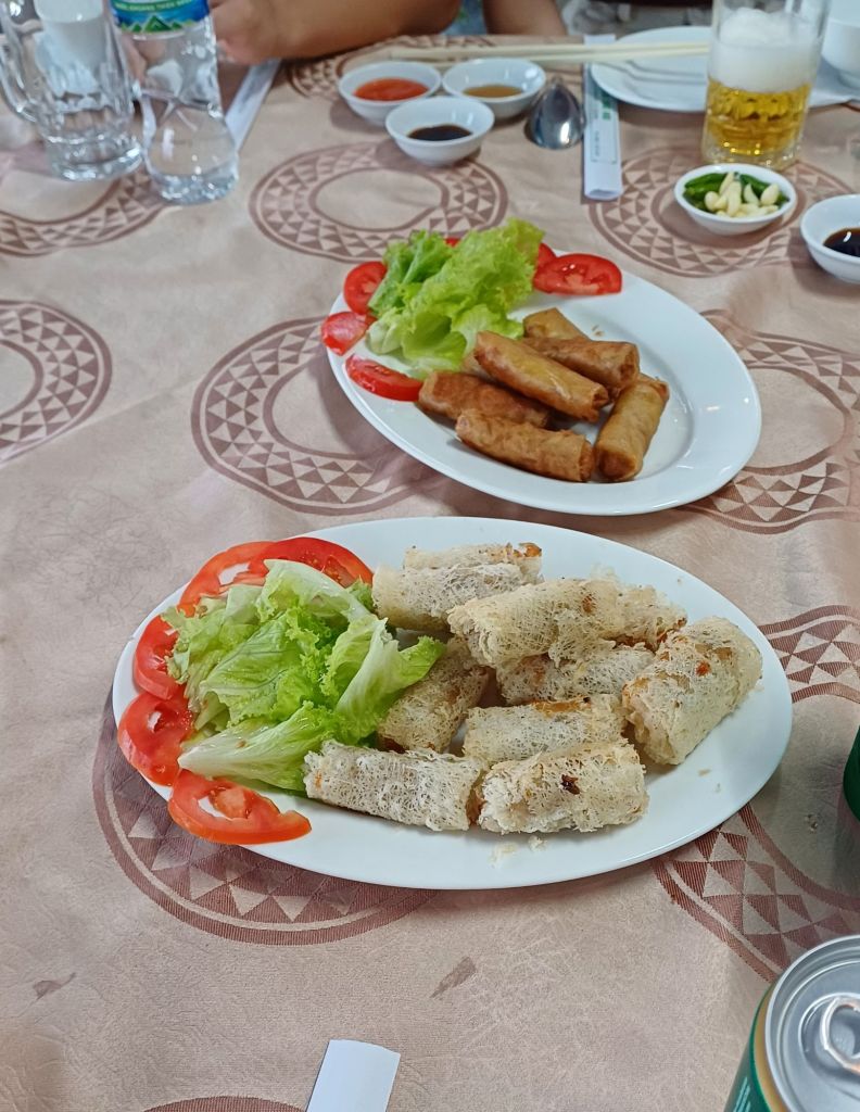 Nach dem Besuch der Pagode chauffierte uns Duc zu demselben Restaurant am Fluss, wo wir bereits gestern diniert hatten und wieder denselben Tisch eingedeckt vorfanden. Mein Schwager hatte teilweise die gleichen, teilweise auch andere Speisen ausgewählt, beispielsweise eine etwas andere Suppe, panierten Tintenfisch, Frühlings- und Sommerollen (vegetarisch). Es gab auch wieder gebratenen Tofu und Gemüse, aber anderes als gestern. Die Frühlings- und Sommerrollen waren die besten, die ich je gegessen habe, einfach großartig. Die Suppe gefiel mir auch sehr gut, und den Tofu mochte ich schon gestern. Ich probierte ein Stück Tintenfisch, aber ich mag die Konsistenz nicht so. Dazu gab es für mich zwei Bia Saigon Special. Tja, und das Ganze kostete für fünf Personen umgerechnet keine 25 Euro… Übrigens: Das Frühstücksbuffet im Hotel kostete mit 150.000 Dong pro Nase knapp sechs Euro.