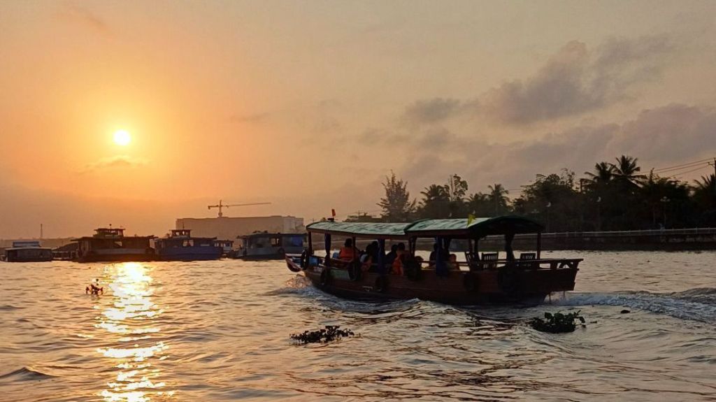 Nach diesem kurzen Abstecher ging es retour zum Startpunkt der Bootstour. Als wir unterwegs dorthin waren, ging die Sonne auf uns schuf eine faszinierende Atmosphäre auf dem Wasser, auf dem sich zahlreiche Boote tummelten, um Waren anzubieten oder zu transportieren. Am Ufer gab es derweil einige Möglichkeiten, auf festgemachten Booten zu frühstücken. Wir tuckerten wieder zurück zum Anleger, den wir zu Fuß gut von Duc’s Haus erreichen konnten.