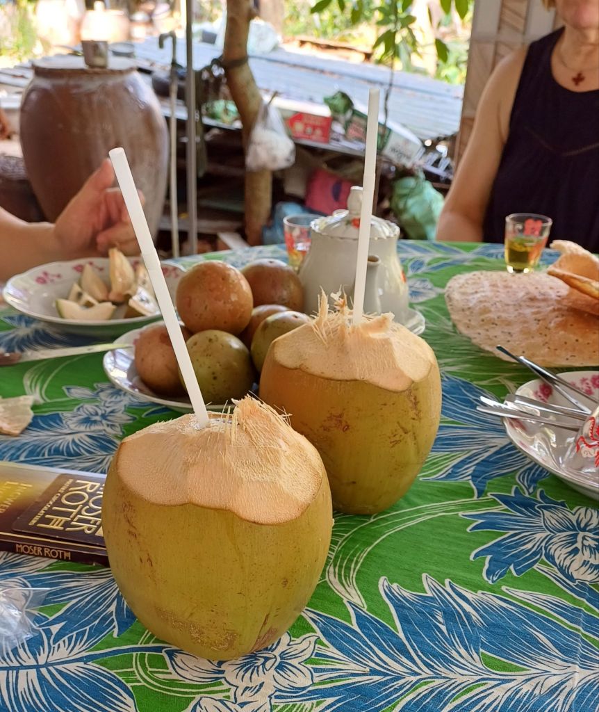 Wir nahmen noch eine Runde Smoothies und Säfte aus dem Saftladen der Schwiegertochter zu uns und suchten dann unsere Betten auf. Das werde ich jetzt auch wieder tun – bis zum Aufstehen um sieben bleiben mir nur noch weniger als zwei Stunden. Wir treffen uns um halb acht, um auswärts mit großem Buffet zu frühstücken. Danach machen wir eine Tour mit einem Kleinbus, wenn ich es recht verstanden habe, besuchen wir das Dorf, in dem mein Schwager aufgewachsen ist. Insgesamt bleiben wir noch zwei (oder drei?) Nächte in Can Tho, bis es mit dem Flieger von Can Tho aus nach Da Nang geht (wo mein älterer Neffe und seine Freundin zur Zeit leben). Später mehr. Ich kann das noch nicht veröffentlichen, WLAN-Passwort und SIM-Karten gibt es erst nachher.