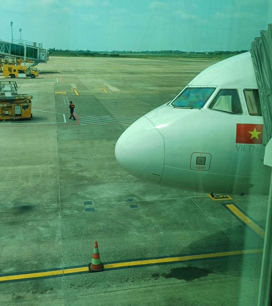 Nun, bisher war alles sehr entspannt. Meine Schwester, ein Freund meines Neffen, den wir in Vietnam besuchen und ich wurden vom Vater des besagten Freundes zum Bahnhof Bardowick gefahren. Von dort aus ging es mit dem Metronom zum Hamburg-Hauptbahnhof, und von da mit der S1 nach Hamburg-Fuhlsbüttel zum Flughafen. Wir haben unser Gebäck konventionell auf (am Schalter) und hingen dann noch eine Stunde bei McDonald’s mit Blick auf das Vorfeld herum.